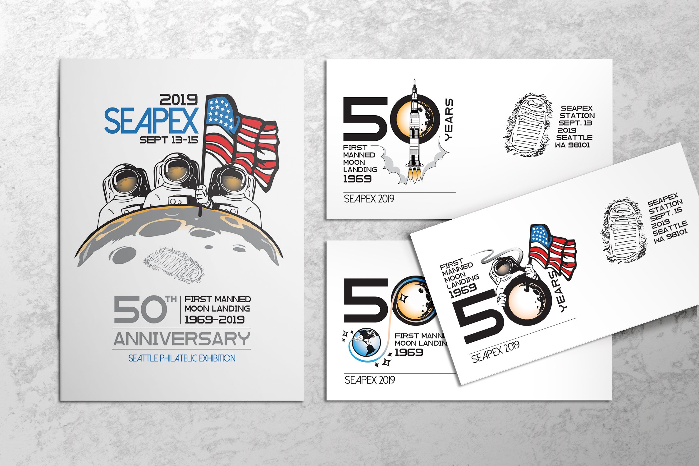 Another exhibition portrayed three moments of the 1969 moon landing: the launch, the flight path, and the moon exploration. Each cancel stamp was designed within strict U.S. Postal Service guidelines.