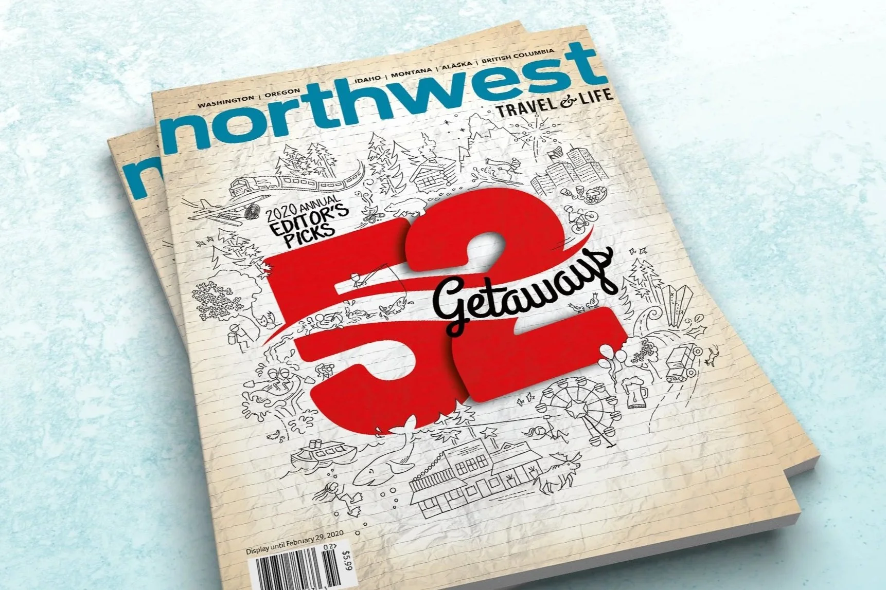 Project: Northwest Travel & Life (NWTL) magazine consists of beautiful photos and helpful tips to plan your next adventure. As creative director I designed a unique, hand-drawn doodle depicting adventures highlighted in the 52 Getaways issue.