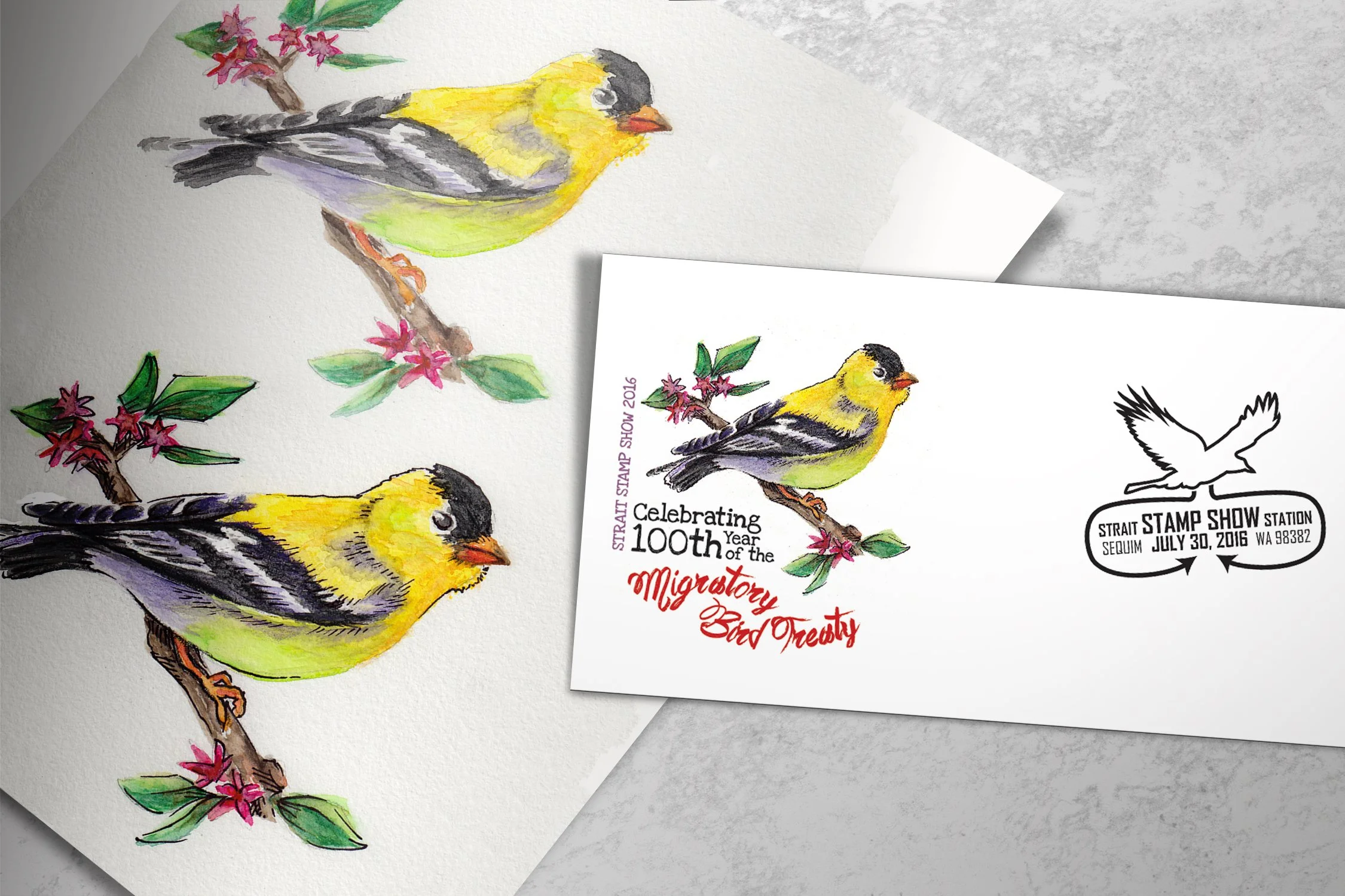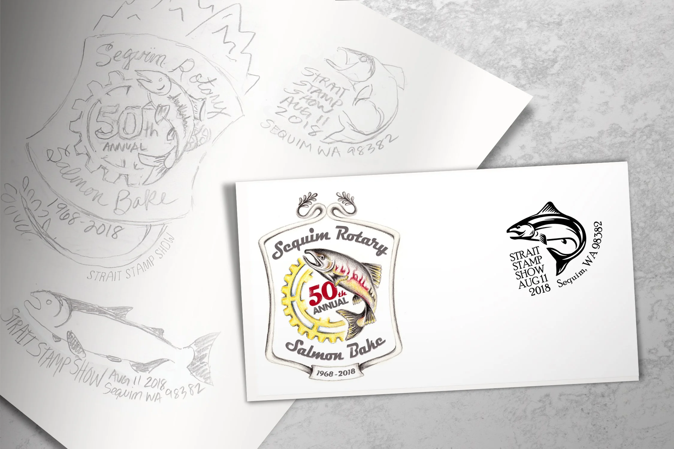 Project: The Strait Stamp Society holds an annual stamp show in Sequim and commissioned me each year to design one envelope cachet to commemorate a local anniversary. For two different events I created a watercolor illustration to honor the Migratory Bird Treaty and combined hand-drawn illustrations and vector text to celebrate the local Rotary Club Salmon Bake.